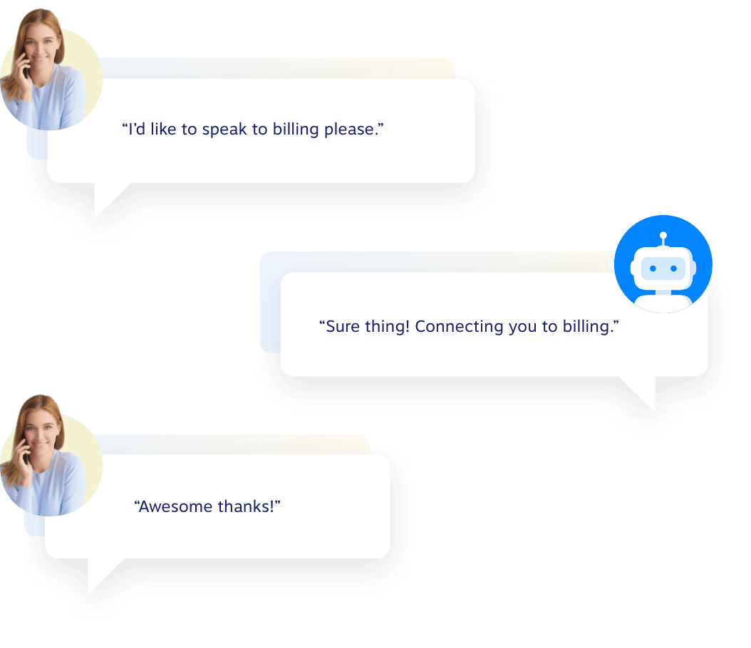 Replace multi-level phone menus with automated call flows that include speech recognition and text-to-speech. And, use our Smart Attendant to create dynamic, personalized interactions with your callers. Let Virtual Agents autonomously handle routine and repetitive transactions while your reps focus on higher-value interactions.