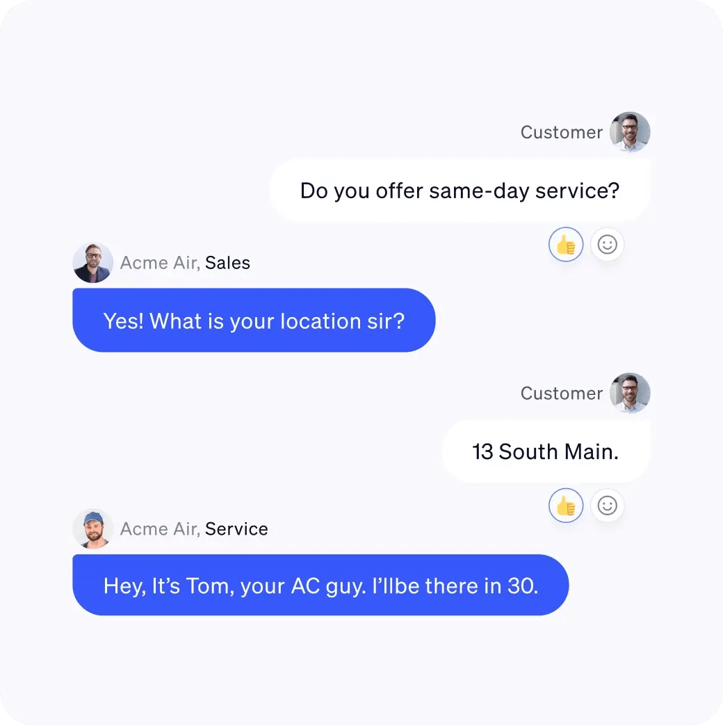 Offer a seamless, unified experience that turns prospects into customers. Both Sales and Service join the SMS conversation to build trust and increase efficiency.