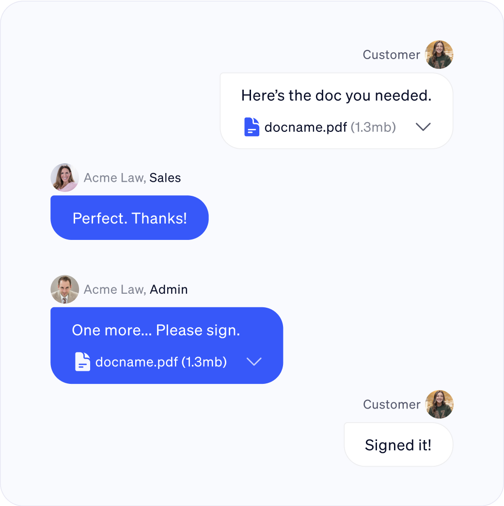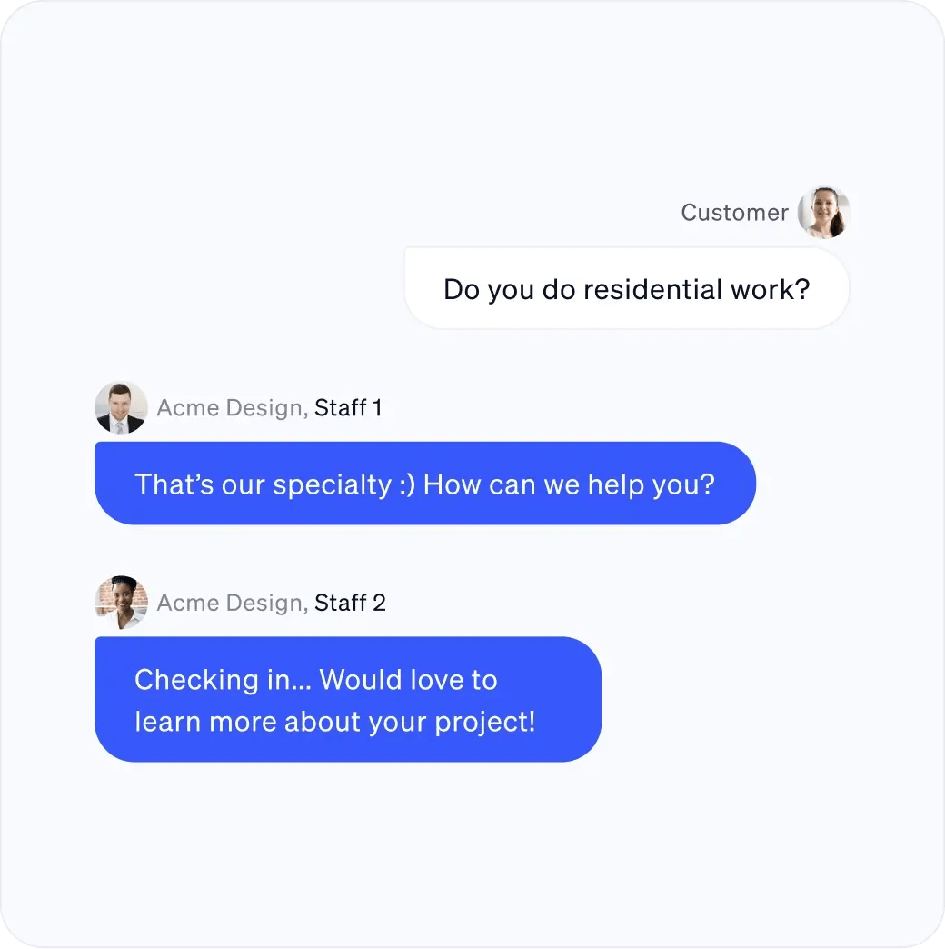 Make it easy for clients to work with you. The whole team, from Admins to Owners can join in the text to ensure nothing gets missed.